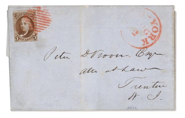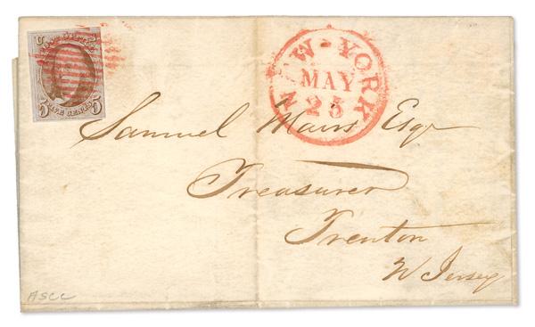 1847, 5¢ red brown (Scott 1), four-margined example (just clear at right), on May 25, 1850 folded letter sheet from New York to Trenton, N Jersey; stamp tied by red square grid cancel with matching postmark at right; cover with central vertical file fold and light soiling, Fine to Very Fine. Scott $500. (Image)