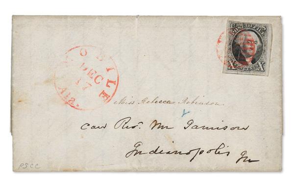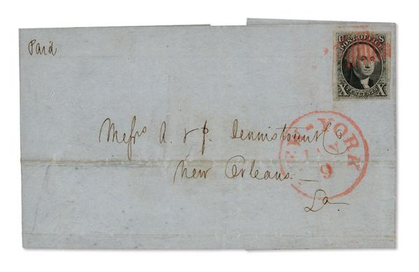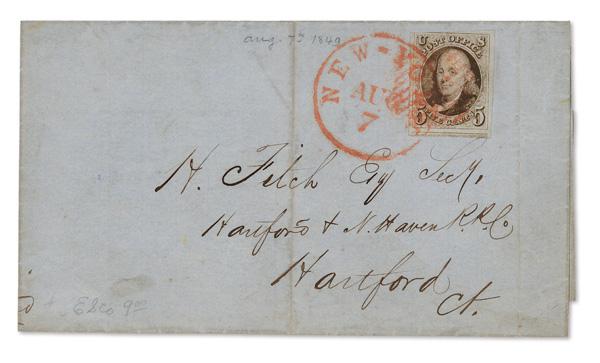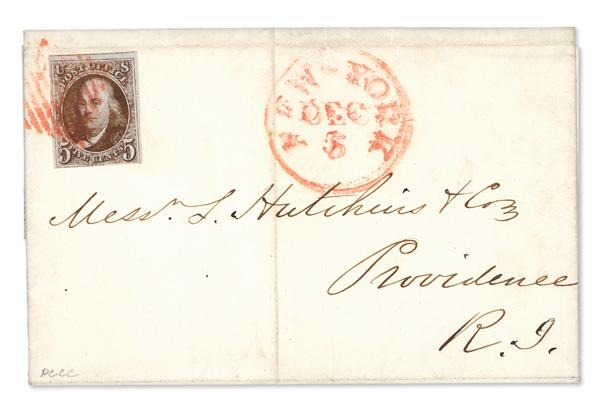 1847, 5¢ brown (Scott 1 var.), nearly four-margined example in handsome color, tied by red square grid postmark on folded letter sheet to Providence, R.I., datelined New York, Dec. 5, 1848; matching New-York postmark at right; business correspondence noting, in part, "the cotton market not brisk"; vertical file fold at center, otherwise remarkably fresh, Fine to Very Fine. Scott $500. (Image)
