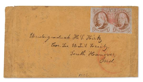 1847, 5¢ red brown (Scott 1), horizontal pair with margins clear all around, on undated cover to South Hanover, Ind.; stamps tied by red circular grid cancels with "New-York/Jul/25" postmark below; late printing, the left stamp with diagonal crease at bottom left, Fine to Very Fine. Scott $1,150. (Image)