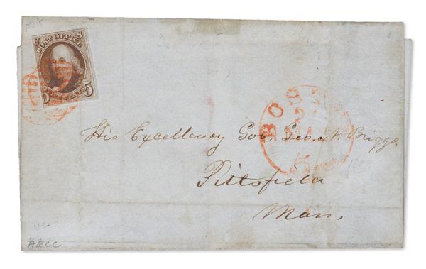 1847, 5¢ red brown (Scott 1), three-margined example (in at left) in dark shade, on folded address sheet from Boston to Governor George N. Briggs [served 1844-51] in Pittsfield, Mass.; stamp tied by two strikes of red circular grid cancel with "Boston/21/May/5 Charlotte Town" postmark at right; cover with light soiling and various file folds, one vertically through stamp, Fine to Very Fine. Scott $500. (Image)