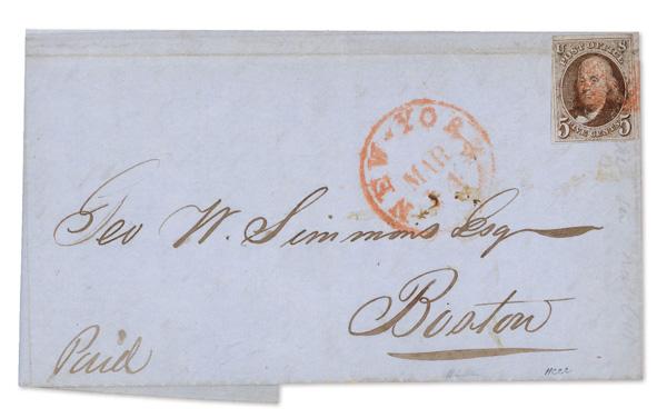 1847, 5¢ red brown (Scott 1), nearly four-margined single in what appears to be brown shade, tied by red grid cancel with matching "New-York/Mar/14" postmark to left, on 1848-datelined blue folded letter sheet to Boston; stamp fresh with strong color and detail plus ample to large margins, but with creases, Fine to Very Fine. Scott $500. (Image)