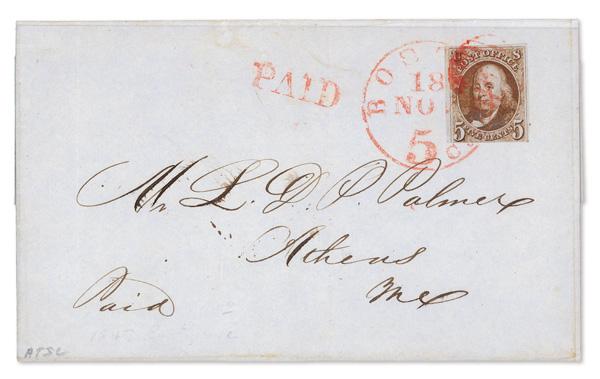 1847, 5¢ red brown (Scott 1), fresh single on datelined Nov. 18, 1847 folded letter sheet from Boston to Athens, ME; stamp tied by red circular grid and "Boston/18/Nov/5 Charlotte Town" postmark, with matching straightline "PAID" handstamp at left, similarly noted in manuscript at lower left; stamp with three ample to large margins and tiny corner crease at bottom right; cover sound and fresh, Fine to Very Fine, a pretty first-year use. Scott $500. (Image)