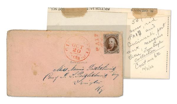 1847, 5¢ red brown (Scott 1), single with stunning color on cover from Cincinnati to Lexington, KY, the stamp cancelled by red circular grid with vertical "PAID" immediately to left, Cincinnati rate-inclusive postmark of Oct. 20 at left; sender's blind emboss (H F Desilver/Bookseller/Cincinnati O.) on backflap; stamp with margins in to just clear, cover with corner wear; accompanied by M. Ohlman's Auction card with penciled note "Cost me 6.00 10/3/23", Fine to Very Fine, and an unusual cancel. Scott $500. (Image)
