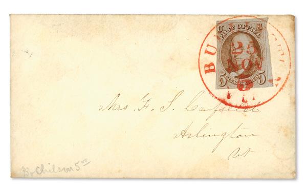 1847, 5¢ red brown (Scott 1), three-margined example (in at left) in attractive pale shade on almost bluish paper, with socked-on-the-nose "Burlington/25/Nov/5/Vt." postmark on small cover to Arlignton, Vt.; cover with light toning to right edge, but otherwise sound, Fine to Very Fine. Scott $500. (Image)