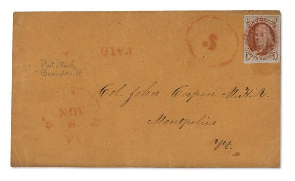 1847, 5¢ red brown (Scott 1), three-margined example (in at left), on dark cover to Montpelier, Vt., the stamp lightly tied by red "weave" grid cancel with matching "5" in oval, "PAID" straightline and Nov. 6 Burlington, Vt. postmark (penciled "Post Mark 'Brandon, Vt'" incorrect); ink stain on reverse, Fine to Very Fine. Scott $500. (Image)