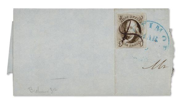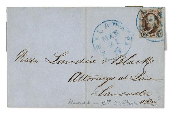 1847, 5¢ red brown (Scott 1), four-margined example (just clear at top) tied on blue folded address sheet to Lancaster, Pa. by one of two strikes of Philadelphia rate-inclusive postmark dated May 21; docketed on reverse "May 21st/49"; vertical file fold, otherwise clean and sound, Fine to Very Fine. Scott $625. (Image)