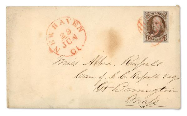 1847, 5¢ red brown, dot in "S" variety (Scott 1 var.), pretty example with full framelines all around (margins clear save just skimming at top) tied by two red circular grid cancels with matching June 29 New Haven, Ct. postmark at left, on cover to Gt. Barrington, Mass.; stain at center affecting neither stamp nor markings; accompanied by 1924 Scott Stamp & Coin. Co. auction page, Fine to Very Fine. Scott $500+. (Image)