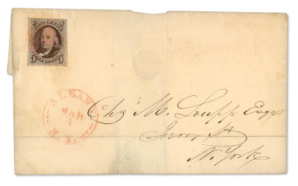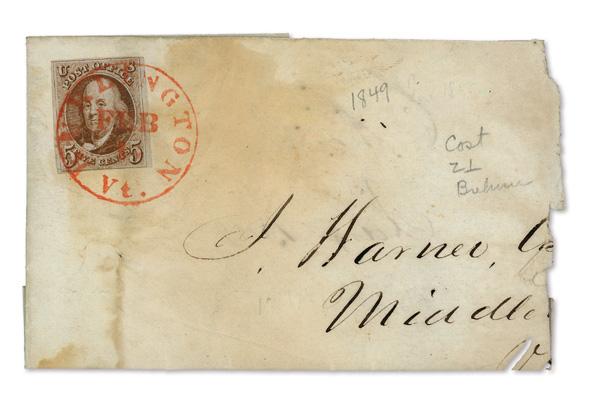 1847, 5¢ red brown (Scott 1), four-margined single (close but clear top and bottom) with eye-catching color, tied on folded address sheet by red "Burlington/Feb/1/Vt." postmark; addressed to Middlebury, Vt. and docketed within 1849; stamp with barely perceptible nick at bottom left; stain on cover not appearing to affect stamp, Fine to Very Fine. Scott $575. (Image)