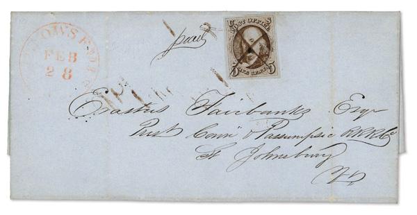 1847, 5¢ red brown (Scott 1), lovely four-margined example with bold color, manuscript "X"-cancelled on blue folded letter sheet to St. Johnsbury, Vt.; letter datelined "Springfield, Mass. Feb 28th 1850", with manuscript "Paid" and faint red Bellows Falls, Vt. Feb. 28 postmark to left of stamp; two vertical file folds of no consequence, nearly Very Fine. Scott $500. (Image)