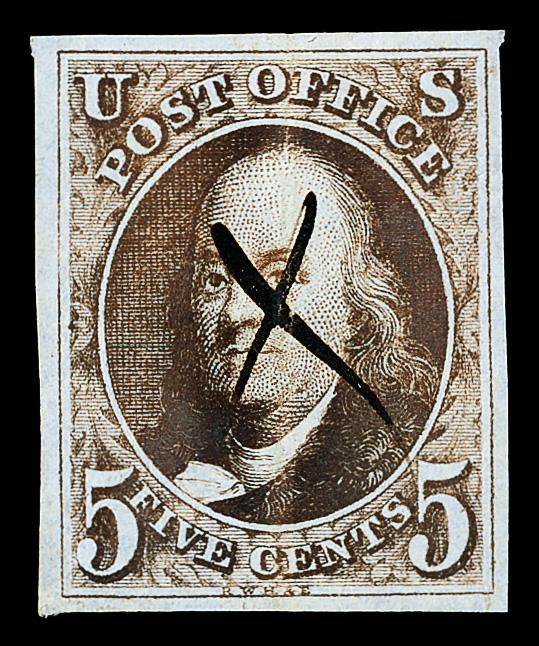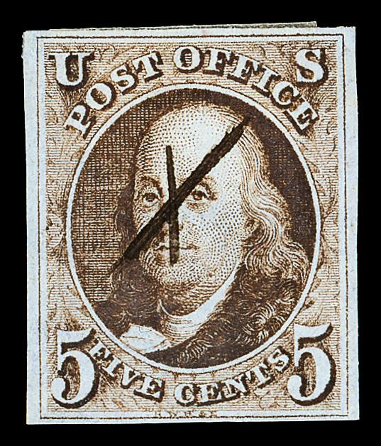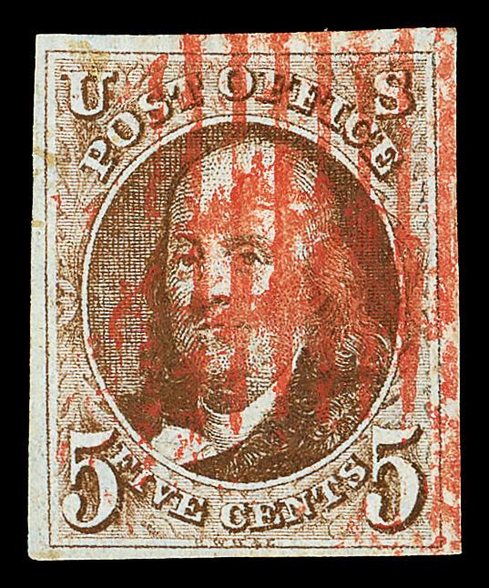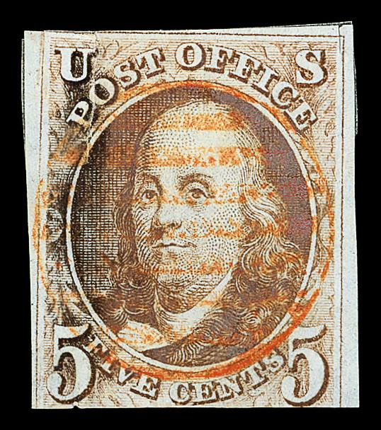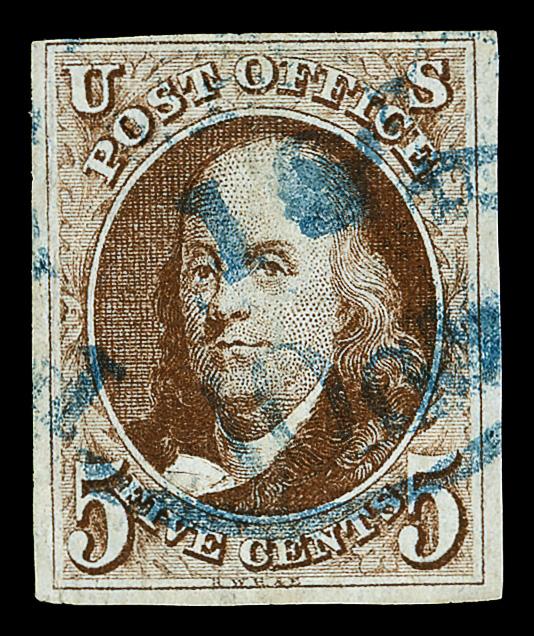 1847, 5¢ red brown (Scott 1), with fresh, bright color, nearly four-margined, with blue town postmark; accompanied by 1924 Scott Auctions card as #28a, Fine to Very Fine. Scott $550. (Image)