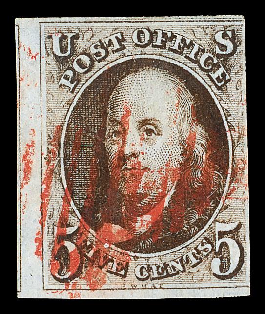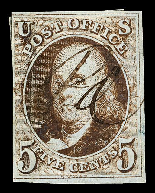 1847, 5¢ red brown (Scott 1), 3½-margined example with clean impression and manuscript cancel, Fine to Very Fine. Scott $250. (Image)
