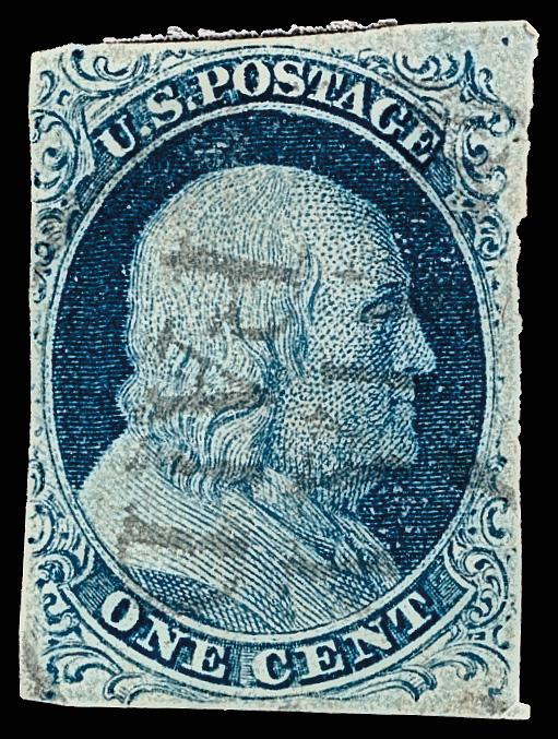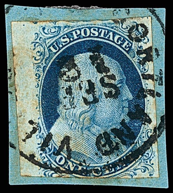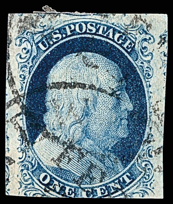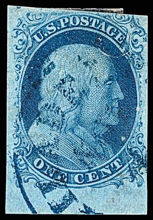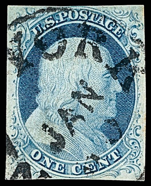 1851, 1¢ blue, type II (Scott 7), with eye-catching color and three large margins (in at bottom), postmarks light and nearly face-free, Fine to Very Fine. Scott $140. (Image)