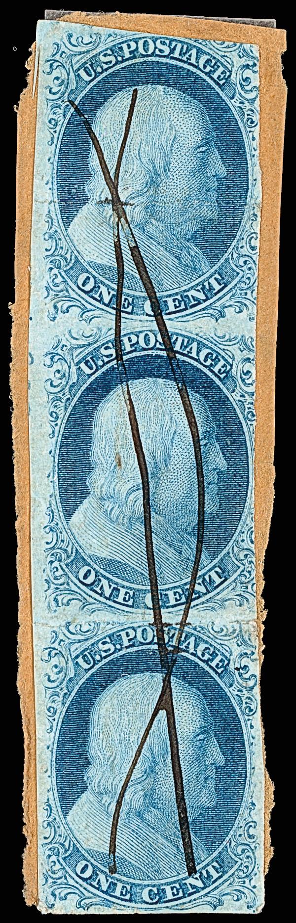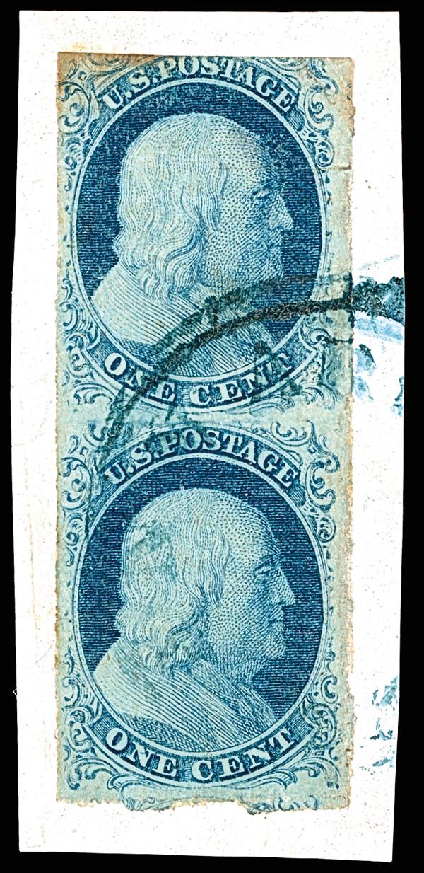 1851, 1¢ blue, type II (Scott 7), vertical pair, with blue postmark; top stamp small faults, bottom stamp with nice margins, Fine to Very Fine. Scott $308. (Image)