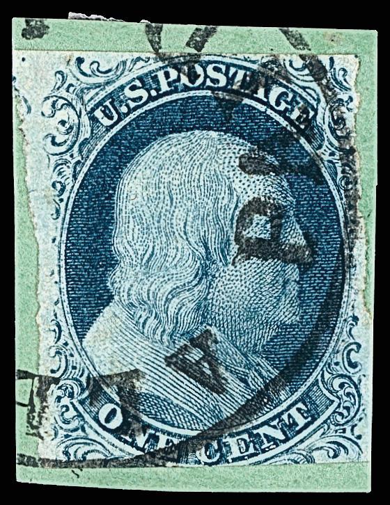 1851, 1¢ blue, type II (Scott 7), crisply printed example on close-cut green piece, cancelled by Albany, NY "PAID" postmark; scissors-cut top and bottom, torn sides, Fine to Very Fine. Scott $145. (Image)