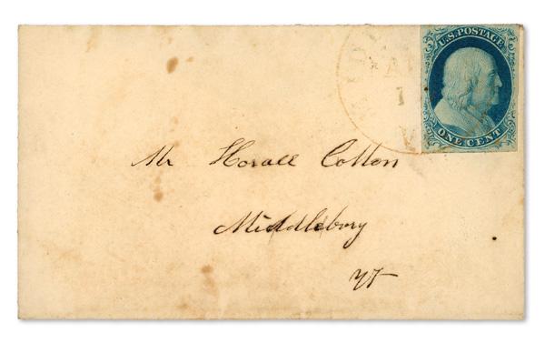 1851, 1¢ blue, type II (Scott 7), pretty four-margined example (close at top), tied on small-format cover by faint Middlebury, Vt. c.d.s.; used locally, with red wafer on backflap, Fine to Very Fine. Scott $180. (Image)