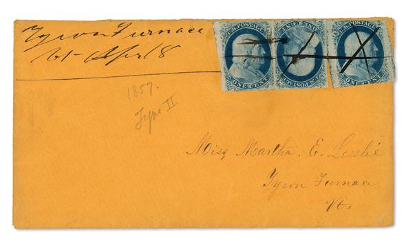 1851, 1¢ blue, type II (Scott 7), three singles on orange local cover, tied by manuscript cancels with manuscript "Tyson Furnace/Ct April 8" manuscript postmark at left; with enclosure datelined "Northfield Vermont/April 5, 1857", Fine to Very Fine. Scott $440. (Image)