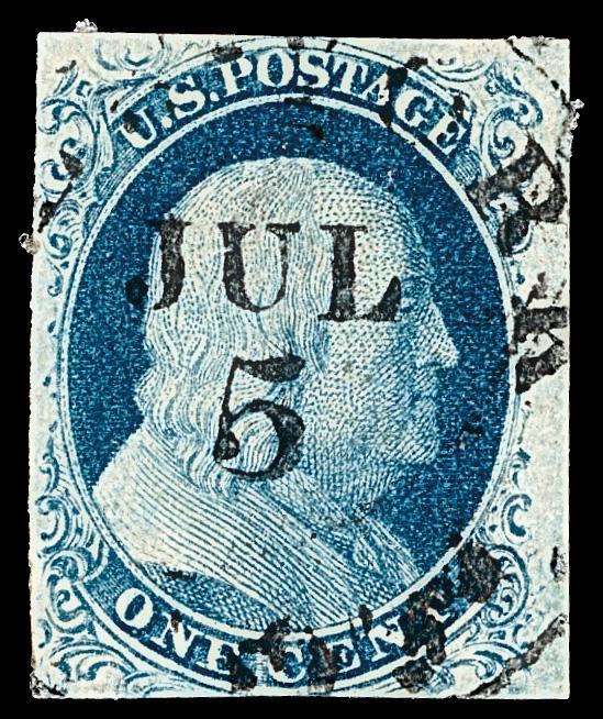 1851, 1¢ blue, type II (Scott 7), clean with bright color and a socked-on-the-nose New York July 5 postmark, margins grazing to full, Fine to Very Fine, add this one to your calendar. Scott $140. (Image)