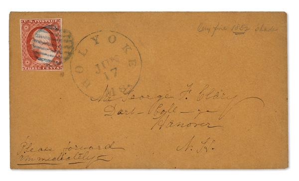 1851, 3¢ orange brown, type II (Scott 10A), four-margined (close but clear bottom left) example with intense color and pristine paper tied by circular grid cancel with "Holyoke/Jun/17/Ms." postmark alongside; on cover to Hanover, N.H.; remnants of black wax seal on reverse; penciled notation "Very fine 1852 shade", nearly Very Fine. Scott $200. (Image)