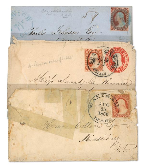 1851, 3¢ orange brown, type II (Scott 10A), three examples, one cover from Waltham, MA to Middlebury, VT with bold, clean postmark; one uprating 3¢ red entire (Type U5) from Springfield, MA to Rutland, VT; one on partial folded address sheet docketed May 16, 1852 tied by blue cancel with matching Norwich, CT May 17 postmark at left (addressee's town removed), Very Good to Fine. Scott $600. (Image)