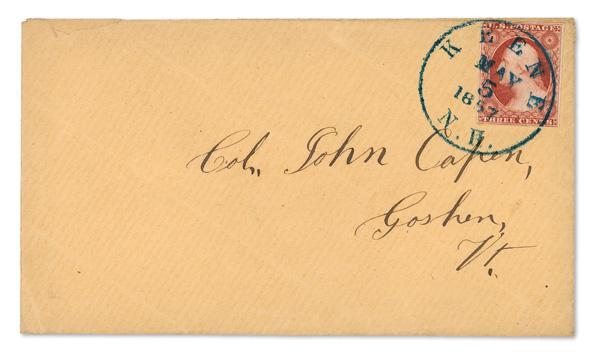 1852, 3¢ dull red, type I (Scott 11), bright example with clear to full margins all around, on cover to Goshen, Vt.; stamp tied by clean strike of blue "Keene/May/5/1857/N.H." postmark; top corner crease left, wrinkle from placement right, Fine to Very Fine. Scott $37. (Image)
