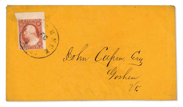 1852, 3¢ dull red, type II (Scott 11A), pristine top right corner margin single, tied by indistinct town postmark on orange cover to Goshen, Vt, Very Fine. (Image)