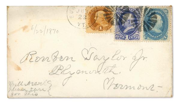 1861, 1¢ blue (Scott 63), plus 1¢ 1869 Pictorial (#112) and 1¢ 1870 National (#145), all tied by two circle-of-Vs fancies plus Burlington VT postmark of June 22 (pencil notation 6/22/1870); stamps fresh, the 1869's grill faintly visible on face; cover addressed to Plymouth, Vermont; a pretty tri-color, three-issue franking, Fine to Very Fine. (Image)