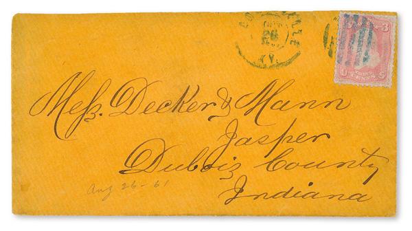 1861, 3¢ pink (Scott 64), tied on orange cover to Jasper, Indiana by blue grid with matching "Louisville/Oct/26/1861/KY." postmark alongside (pencil notation on front of "Aug. 26 — 61" erroneous in our view); stamp with rich, bright color on fresh paper and sound; cover slightly reduced at top but otherwise sound, Fine to Very Fine, with 1994 P.S.E. certificate without reference to date. Scott $700. (Image)