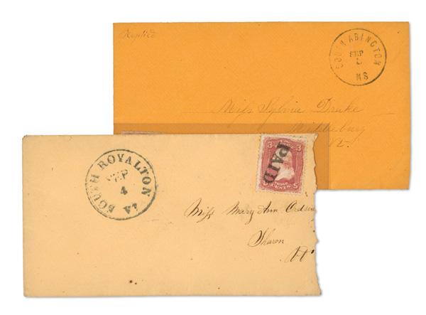 1861, 3¢ rose (Scott 65), two examples, the stamps in shades, each with "PAID" cancel variety; deep-colored example cancelled straightline "PAID" handstamp with South Royalton, Vt. Sept. 4 postmark at left (to Sharon, VT); paler shade tied by "PAID"-in-circle cancel, South Abington, Ms. postmark at top right (to Middlebury, VT), Very Fine strikes. (Image)