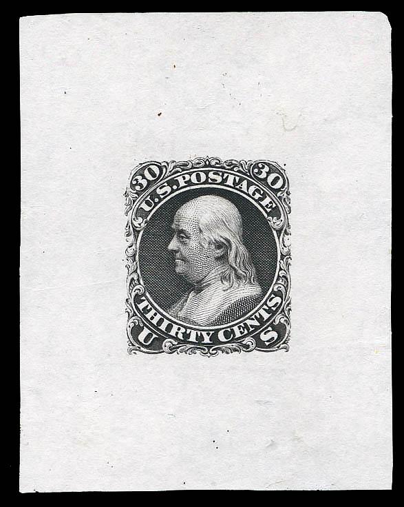 1861, 30¢ Franklin, N.B.N.C. "Premiere Gravure" essay, in black (Scott 71-E2a), trial color large die proof on India paper (formerly No. 61TC1), 46 x 60 mm, removed from card, Fine to Very Fine. Scott $1,750. (Image)
