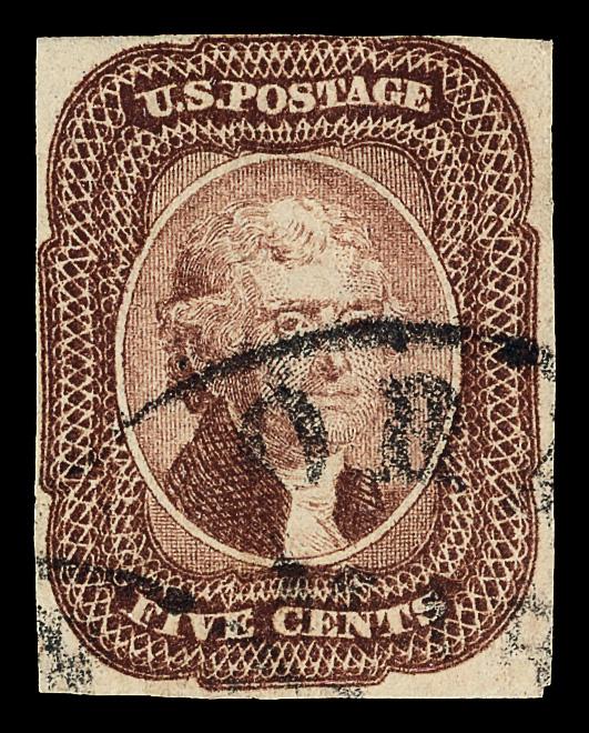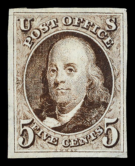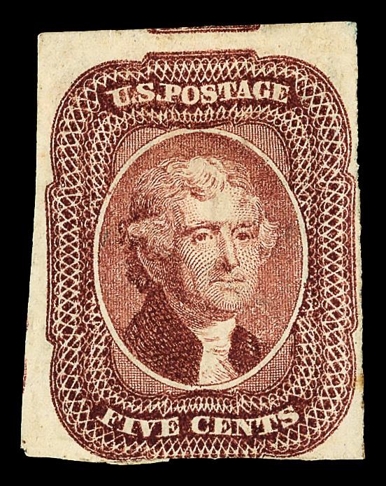 1857, 5¢ red brown, type I (Scott 28), rich color and sharp proof-like impression on bright paper, exceptionally well-centered, only a couple short perfs at top left, unused without gum, still Extremely Fine and extremely scarce, especially in this superior quality. The perforated 5¢ Red Brown (Scott 28) stamps were the first 5¢ perforated stamps to be printed and sent to the post offices. Thus, an estimated 10-15 with original gum, and maybe 20-30 unused without gum, are believed to exist. Most have flaws or are off-center, with 2012 P.F. certificate. Scott $15,000. (Image)