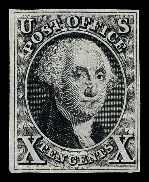 1847, 10¢ black (Scott 2), ample to full margins all around, lovely charcoal color, small corner crease at bottom left and small tear at bottom, both of which are invisible to the naked eye, unused without gum, handsome Very Fine appearance, an unused 10¢ 1847 stamp appears at auction once or twice a year; so if you don't like waiting, we suggest you pursue this example, with 2009 P.F. certificate. Scott $12,500. (Image)