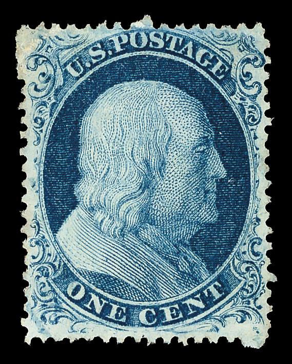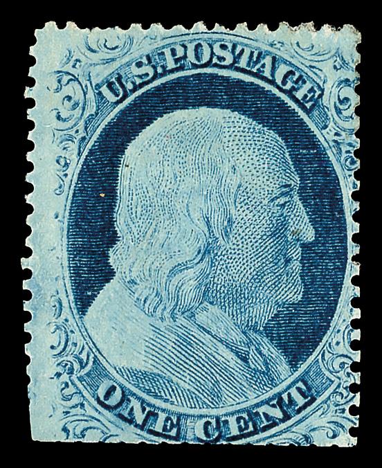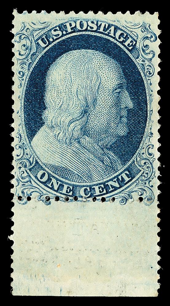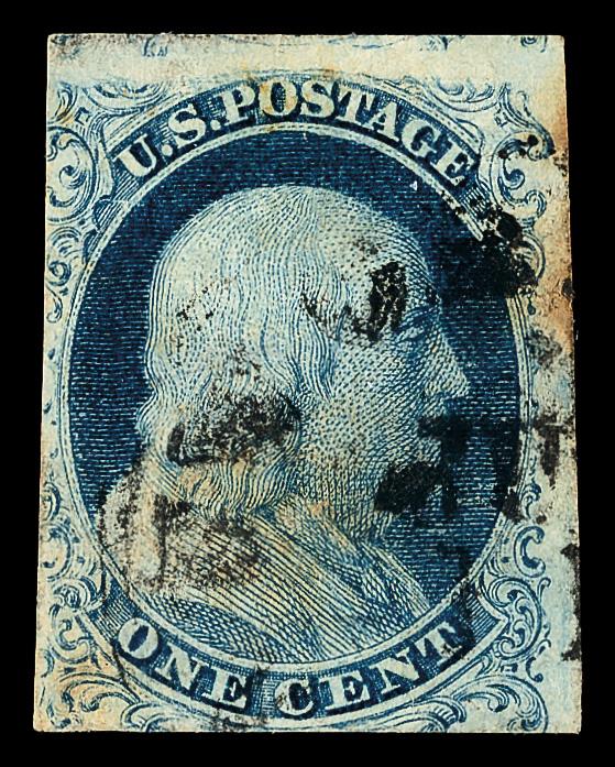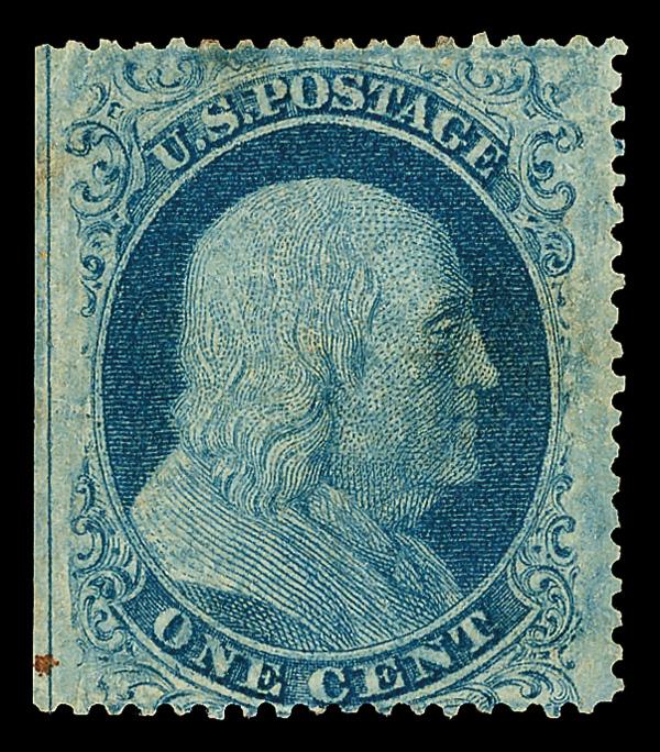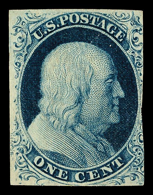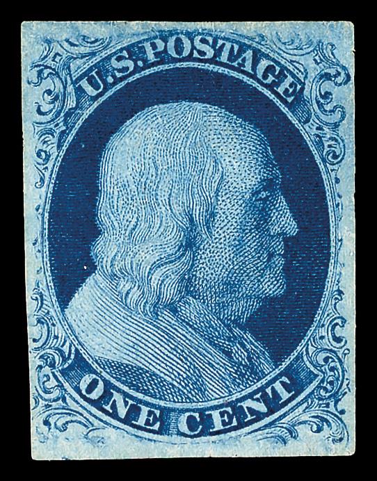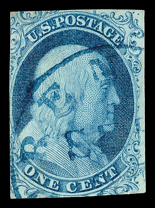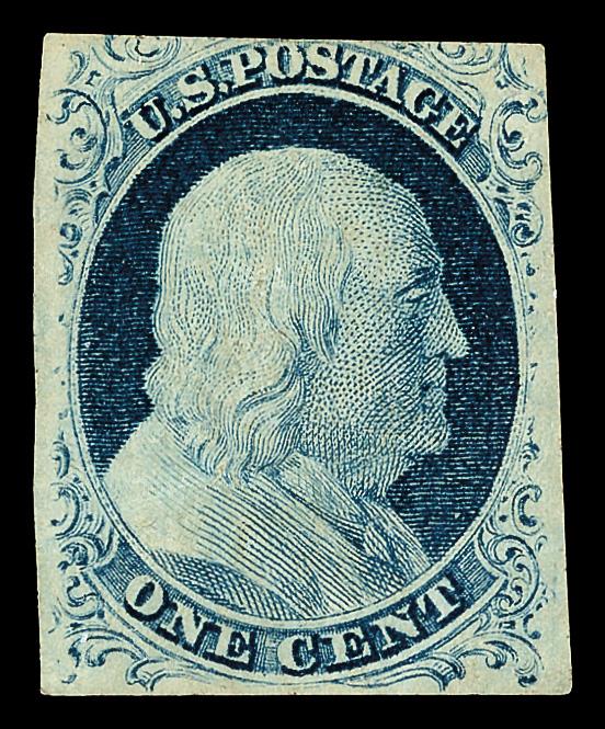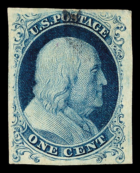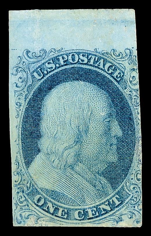 1851, 1¢ blue, type I, one of 3 known unused examples (Scott 5), unused (no gum), enormous full top sheet margin, large margin at left and margins just in other 2 sides, leaving the defining characteristics plainly visible, beautiful bright blue plate 1 Early color, small surface scrape at right and toning which have been professionally minimized, few creases, unused without gum, Fine. The other 2 unused examples are: 1) without gum, originally part of a strip of 3 with Positions 8 and 9R1E when sold in the Ferrary, Hind and Burrus sales, and sold as a single in the Waterhouse (who separated the single), Heathcoate, Wunderlich, Dr. Test and Gross sales; was sold last June for $340,000 hammer; and 2) with original gum and included in an irregular block of eight (Positions 4-9/14-15R1E), #5 with faults, ex Lapham and Dr. Kapiloff; this stamp was discovered in 1998, auctioned by Kelleher that same year and last appeared at auction in the Wingate sale in 2018, ex-Wingate, with 1998 P.F. certificate. Scott $400,000. (Image)