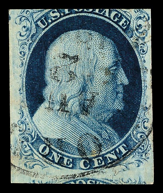 1851, 1¢ blue, type III (Scott 8), position 62R4, large margins at left and bottom including part of adjacent stamp at bottom, ample at right and into at top, deep rich color, neat circular datestamp cancel, almost Fine, with 2002 P.S.E. certificate. Scott $1,650. (Image)