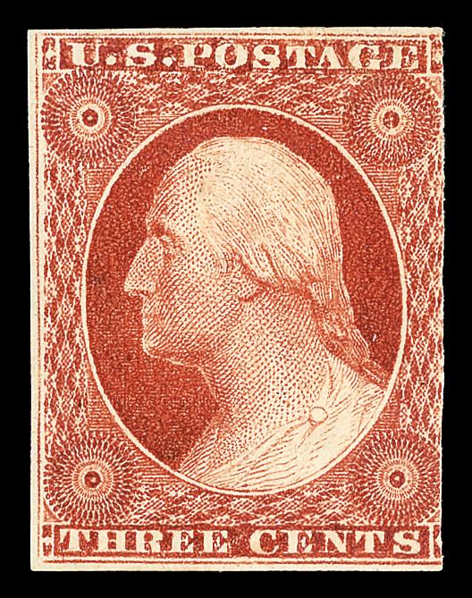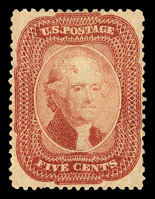 1858, 5¢ brick red, type I (Scott 27), perfectly centered with equal space between the design and the perforations, accompanying certificate notes a single toned perf which has been removed, a tiny thin spot at left center and an added perf tip at upper left, both of which cannot be seen when the stamp is in your album, o.g., previously hinged, lovely Extremely Fine appearance. The earliest documented use of this issue is October 6, 1858, and when the 1851 and 1857 issues were demonetized at the start of the Civil War in 1861, very few remained in Southern post offices (unlike the 90¢ which has an EDU of Sept. 11, 1860 and saw little use). It has been estimated that 20-30 mint o.g. examples of Scott 27 exist. Most are poorly centered and faulty, with 2006 P.F. certificate. Scott $80,000. (Image)