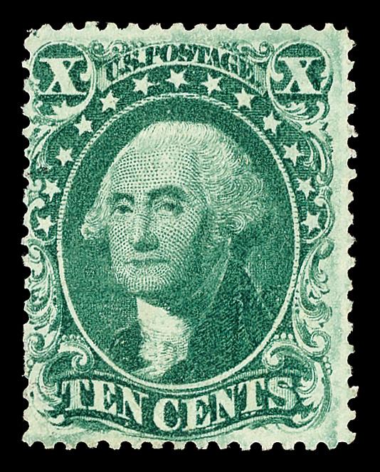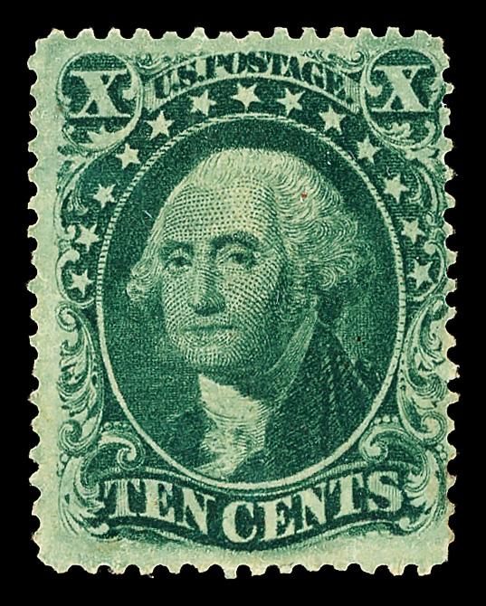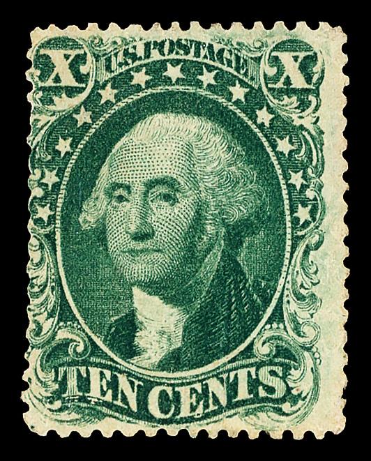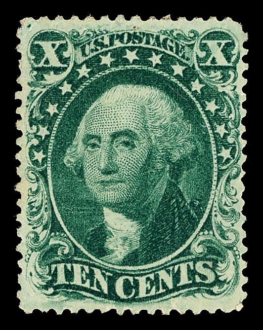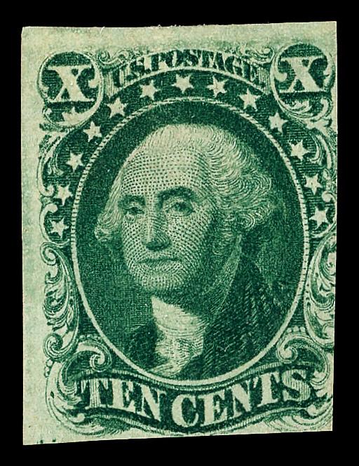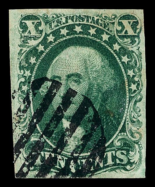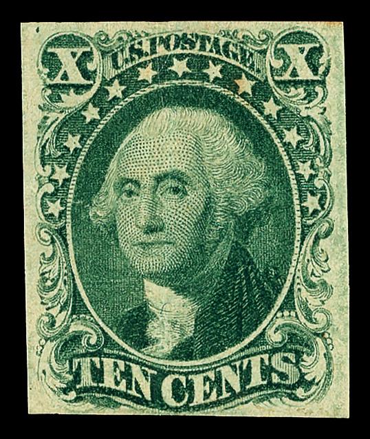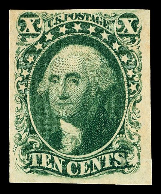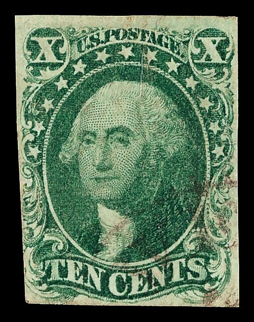 1857, 10¢ green, type I (Scott 31), complete plumes at bottom, remarkably rich color, centered to left, regummed over small filled in thin spot at bottom, reperfed at bottom, small surface scrape, Fine appearance, unused examples, both with and without gum combined, appear on the market once or twice per year, with 2004 P.F. certificate. Scott $11,500. (Image)