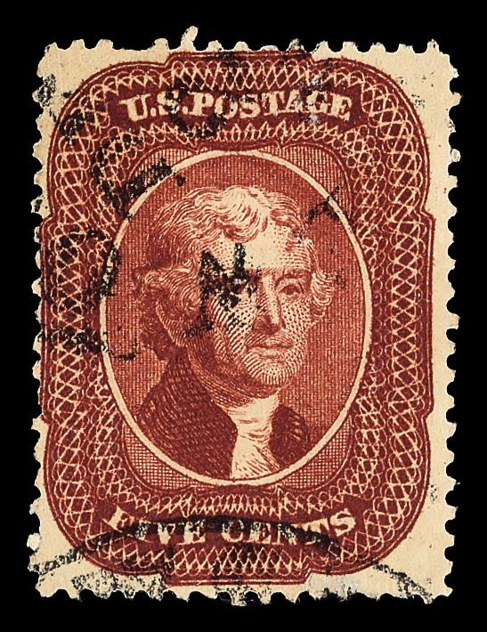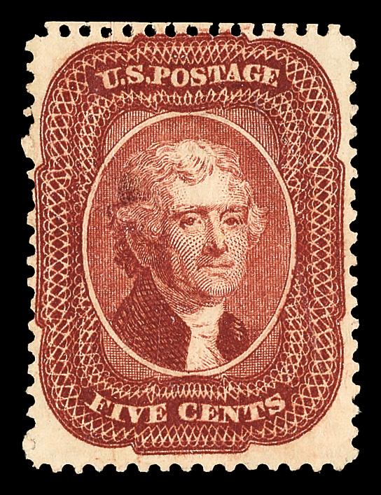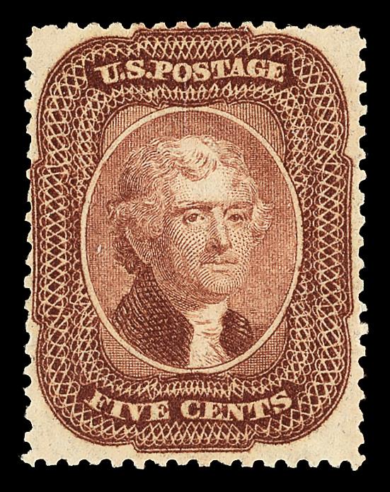 1861, 5¢ orange brown, type II (Scott 30), exceptionally well centered, gorgeous color and sharp impression, remarkably bright and fresh, o.g., couple very light hinge marks, Very Fine to Extremely Fine, a beautiful stamp, with 2014 P.F. certificate graded VF-XF 85. SMQ VF-XF 85; $2,000. Scott $1,500. (Image)