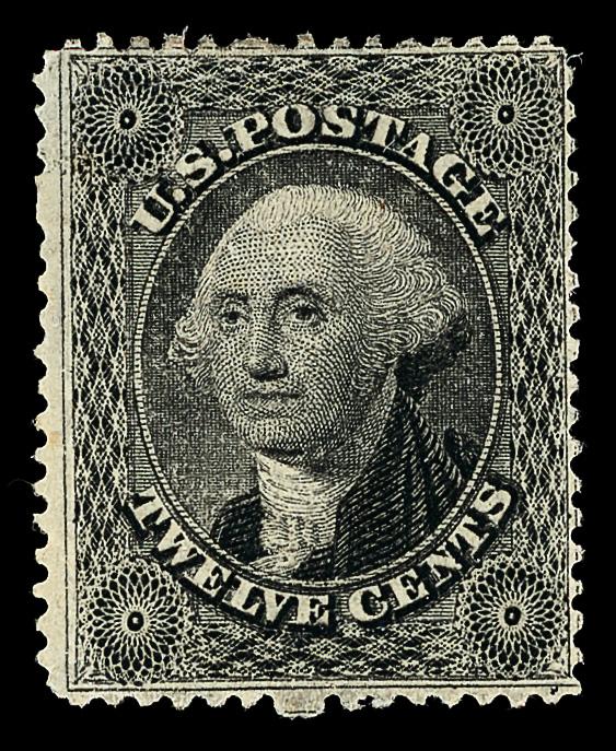 1857, 12¢ black, plate I (Scott 36), lovely charcoal shade on bright white paper, very small corner crease at bottom left, two blind perfs, centered to right, o.g., previously hinged, Fine, with 2006 P.S.E. certificate. Scott $1,700. (Image)