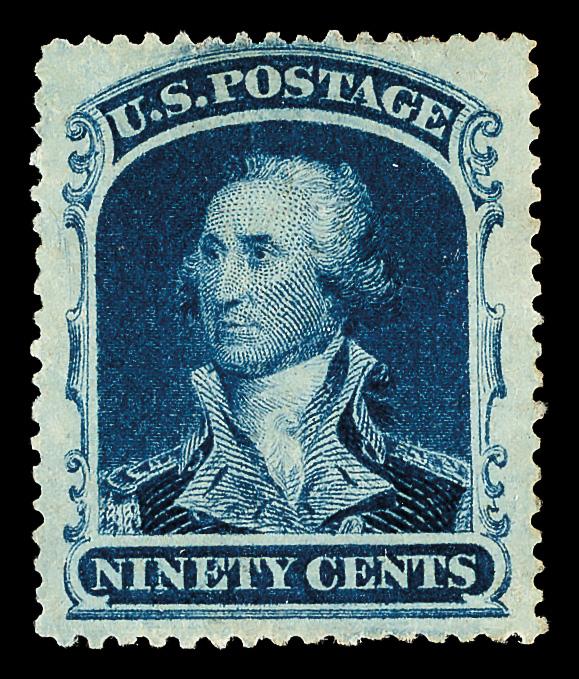 1860, 90¢ blue (Scott 39), dark color, reperfed at right to appear well centered with balanced margins, fresh and full o.g., hinged twice at top, otherwise Extremely Fine, with 2006 P.S.E. certificate. Scott $3,000. (Image)
