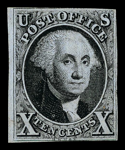 1847, 10¢ black (Scott 2), o.g., hinged, a lovely sound example, eye-catching with intense color and sharp detail; nearly three clear margins, just in at right top, Fine+, with 2000 P.S.E. certificate. Scott $37,500. (Image)