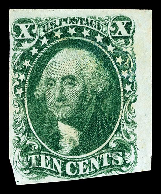 1855, 10¢ green, type I (Scott 13), unused without gum, sound with intense color on glowing white paper; three margins clear to oversized, bottom angled and just nicking design at right, Fine to Very Fine, with 1979 P.F. certificate. Scott $9,000. (Image)