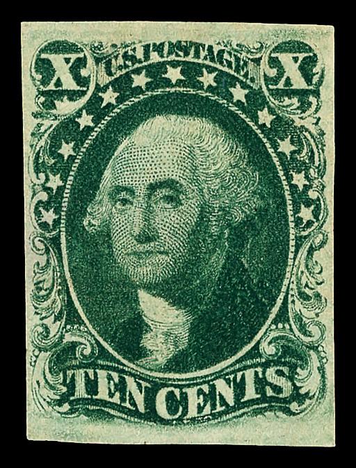 1857, 10¢ green, type I (Scott 31), unused without gum, attention-grabbing with rich color on bright paper, nicely margined with two guide pins at lower left; light diagonal crease at upper left, a couple soiled perforation tips at right, otherwise Fine to Very Fine, with 2017 Crowe certificate. Scott $11,500. (Image)