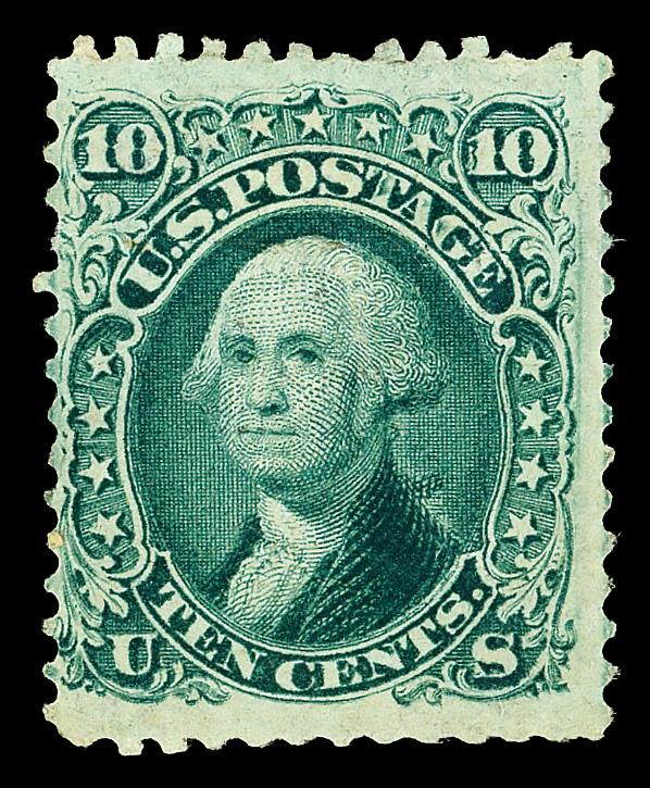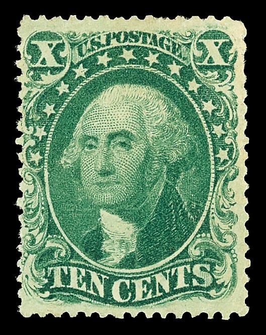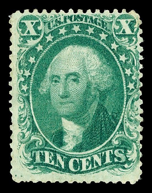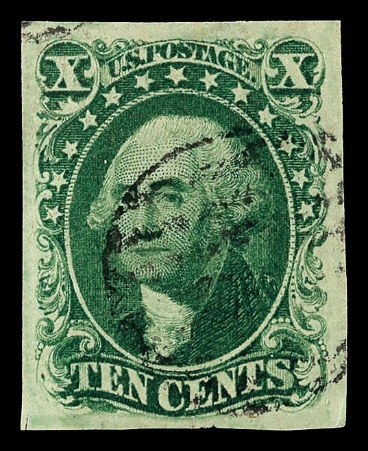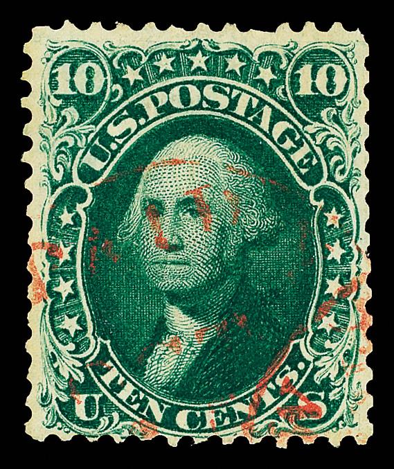 1861, 10¢ dark green, First Design (Scott 62B), a lovely example with robust color and clean impression, fresh with attractive red cancel lightly struck; perforations as per image, Fine to Very Fine. Scott $2,010. (Image)