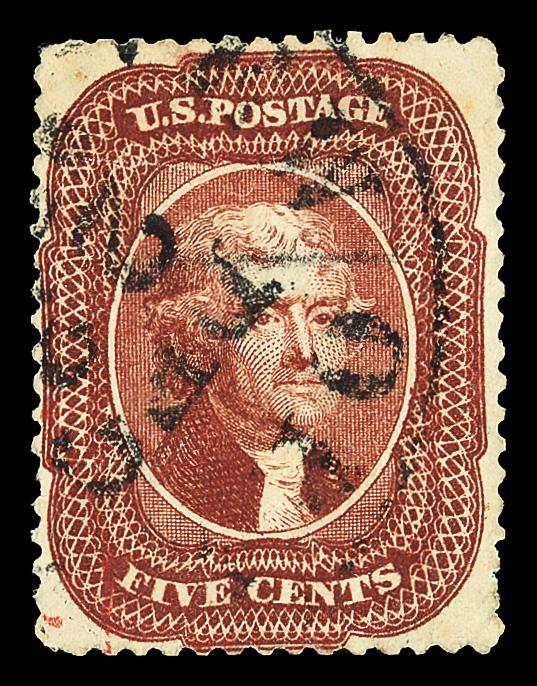 1858, 5¢ Indian red, type I (Scott 28A), position 23R1, alluring example with intense color and fresh paper, black New Orleans c.d.s. (Dec. 22) and trace of red transit cancels; minor faults, otherwise Fine to Very Fine, with 1999 P.S.E. certificate. Scott $3,750. (Image)