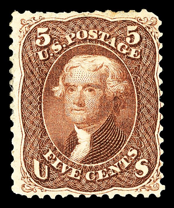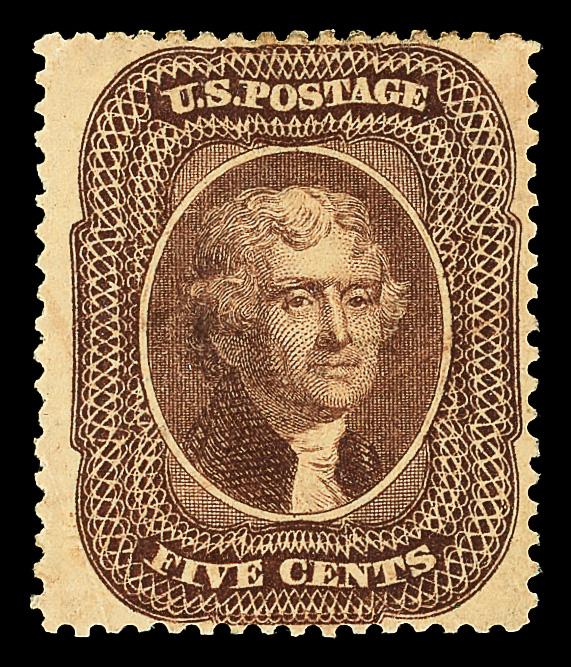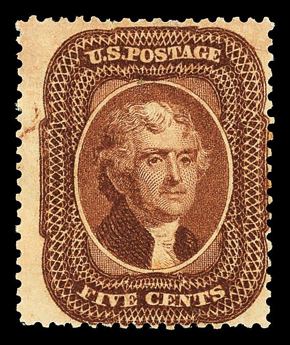 1861, 5¢ orange brown, type II (Scott 30), o.g., hinged, an attractive mint example with solid impression in robust color; pulled perforation at top, small natural offset in left margin; inclusion at top of oval frame not noted on accompanying certificate, otherwise Fine to Very Fine, with 2004 P.F. certificate. Scott $1,500. (Image)