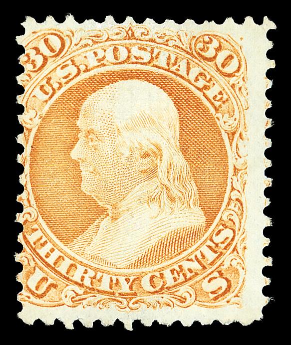 1860, 30¢ orange (Scott 38), o.g., lightly hinged, a striking stamp with exuberant, bold color and appealing centering; lightly soiled at top, Very Fine nonetheless, with 2004 P.S.E. certificate. Scott $1,900. (Image)