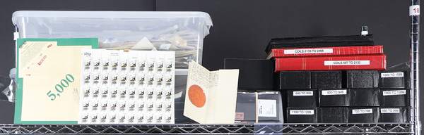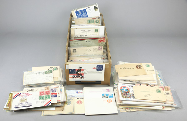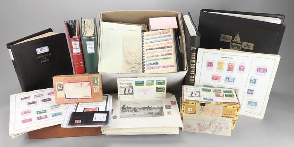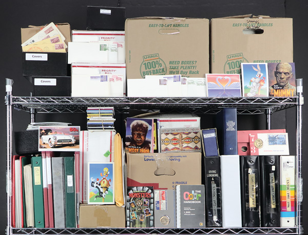 United States, Stamps and covers galore 1940-2021, boxes of US on paper, and a few thousand covers; Postal Card sets including America on the Move, Classic Movie Monsters, Southeastern Lighthouses, Art of the American Indian, Disney Magic, 50s Fins and Chrome, Wile E Coyote, Adopt a Child, The Simpsons, Gulf Coast Lighthouses, Disney Imagination, Cowboys of the Silver Screen, Disney Friendship, Disney Romance, Baseball Sluggers, Daffy Duck, Old Glory, Scenic American Landscapes, Let's Dance, Disney Magic, Pacific Lighthouses, Disney Celebration, and All Aboard; binder with 85 vintage postally used premium postcards; 4 volumes of US First Day Covers (1947-1975), about 400 very clean unaddressed French FDCs, about 100 better UN FDCs, binder of FDOI Souvenir Cards, and much more, Fine to Very Fine. Shipping charges apply - weight 217.6 lbs. (Image)