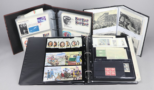 United States, Balance stamps and covers 1892-2015, G&K binder containing used, unused, plate blocks and minisheets; includes #238, 240, 290 (NG), 615 plate block of 6, 833 PB, C6 MNH block of 4, C9 PB, C10 PB, C18 MNH, C31 PB, C46 PB (2), JFK Forever minisheet, Legends of Baseball minisheet, Vintage Circus Posters minisheet; hundreds of worldwide topicals (Space, Royals, Art, Sports); photo album with about 80 European postcards; binder with about 75 Space, Royals, and FDCs, Fine. Shipping charges apply - weight 10.6 lbs. (Video for this lot) (Video2 for this lot) (Video3 for this lot) (Image)