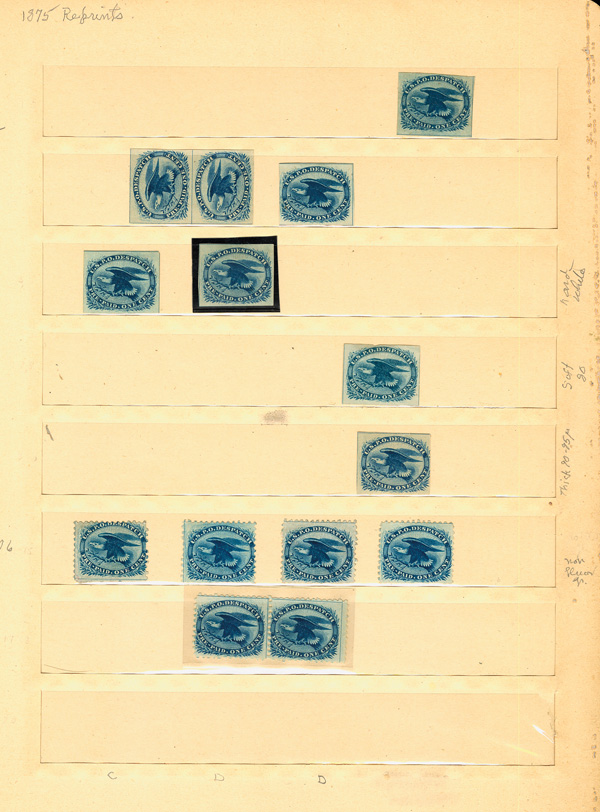 1; 1a; 2; 7(3); 9(2); 9 block; 10A; 11A yellow rose red (cert); 11A; 12 (cert photocopy); 14; 17(3); 20; 23; 25 (cert); 26(2); 30; 31; 32 (3 one cert); 35; 36(2); 36B; 37 (cert); 38 (3 one cert); 40; 41; 42; 43; 46; 56; 64; 64b; 65 block; 67; 67a (2 one cert); 68(5); 69(4 one cert); 70a (cert); 70b (cert); 70c (cert traces og);71(4 one cert); 72 (2 one cert); 73; 73 (strip of three x 2); 76(4); 77(5); 78a; 78b (cert); 85B (2 one cert); 85C; 86 (2 one cert); 87(2); 88(2); 89(2); 90(3 one cert); 91(2); 92(2); 93; 94(2 plus block with cert); 95(2); 96(2); 97(4 one very thin paper var); 98(4 one cert); 99(2 one cert). Many will have small faults as one might come to expect from these earlies, Have a look for yourself, as these are "ready to roll" for internet/show sellers, great for filling a want list, ex Tropical. Scott $425,000 + and/or low estimate (Owner's).
