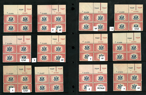 US, "Sexy-Fish", Powerful Plate Block, Reserve Counter Stock, on original counter pages with descriptions, catalog values and/or estimates. These are lots that were kept behind the counter, in a back room safe, waiting for potential buyers that never arose, estimated at a fraction of the original minimums (so cheap!), and includes many useful bread and butter items, generally from Fine to EF, sound unused, mint, an occasional certificate, loads of never hinged, Wide Tops, plenty of Commemoratives, Regular Issues with Washington Franklins, Flat Plates Issues,Airmails, BOB and with the following listing of highlights: