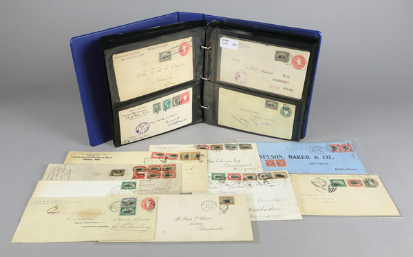 Pan-American Cover Collection (Scott 294-299), set of 6, approximately 150 covers (9 legal sized) and 12 mostly exposition postcards, strength is in the mixed frankings and the foreign destinations (especially Europe) with all backstamped, including 1¢ & 5¢ on legal sized 2¢ entire to Sweden and forwarded to Russia, 2¢ with 3¢ (#268) to India, 2¢ to 8¢ on registered legal sized to Hungary, 1¢ to 8¢ on oversized cover to Germany, 5¢ tied by expo cancel with multicolor all-over expo design to England, 5¢ to Mexico, 5¢ to Honduras with Honduras Commission embossed expo themed design, 5¢ & 8¢ to Austria, 8¢ on 5¢ Columbian entire to Gold Coast, 8¢ (2) on 2¢ entire to Turkey, 2¢ & 5¢ & 10¢ to China, and a complete set on hotel cover to Bermuda (faulty stamps and cover), also includes 2¢ with expo cancels (2), few advertising including undertaking, Cuban cigars, Pharmacists including image of an owl, salt, some Special Delivery, many Registered, few faults as to be expected, beautifully organized in an overstuffed cover album, generally Fine to Very Fine, fully imaged online. Shipping charges apply - weight 4.6 lbs. (Video for this lot) (Video2 for this lot) (Image)